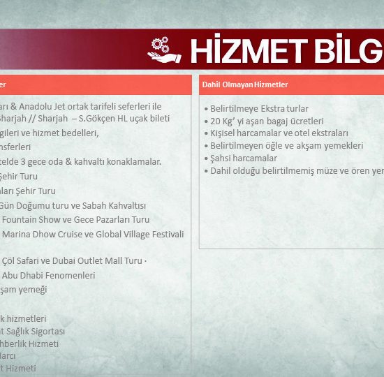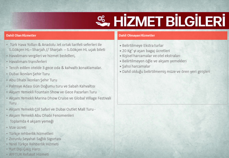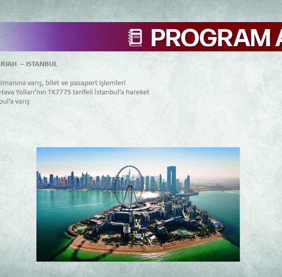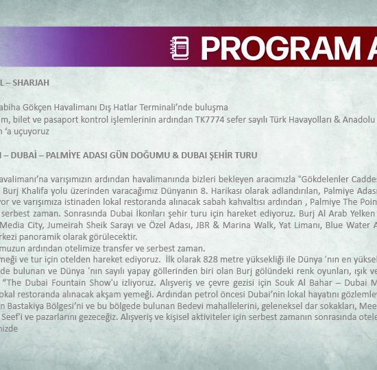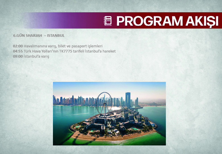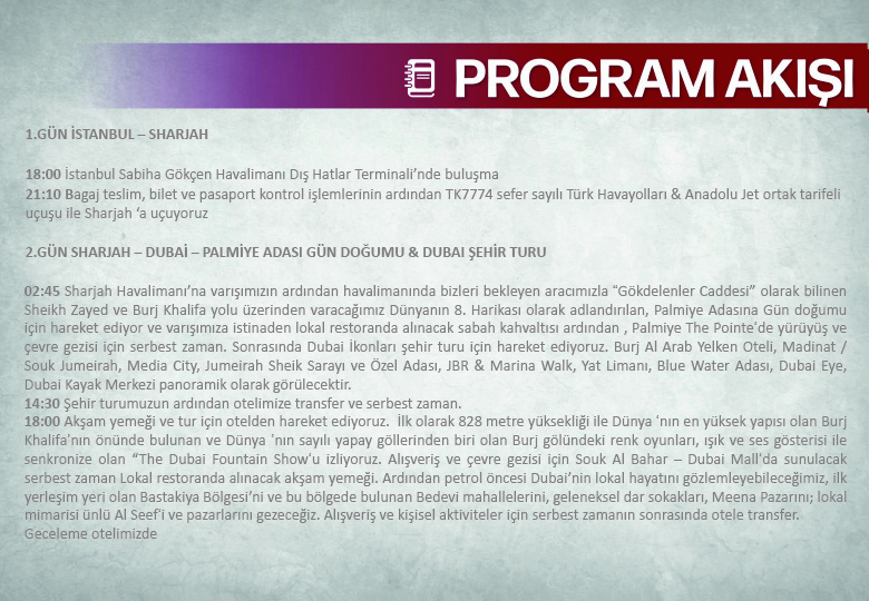 02:45 Sharjah Havalimanı’na varışımızın ardından havalimanında bizleri bekleyen aracımızla “Gökdelenler Caddesi” olarak bilinen Sheikh Zayed ve Burj Khalifa yolu üzerinden varacağımız Dünyanın 8. Harikası olarak adlandırılan, Palmiye Adasına Gün doğumu için hareket ediyor ve varışımıza istinaden lokal restoranda alınacak sabah kahvaltısı ardından , Palmiye The Pointe‘de yürüyüş ve çevre gezisi için serbest zaman. Sonrasında Dubai İkonları şehir turu için hareket ediyoruz. Burj Al Arab Yelken Oteli, Madinat / Souk Jumeirah, Media City, Jumeirah Sheik Sarayı ve Özel Adası, JBR & Marina Walk, Yat Limanı, Blue Water Adası, Dubai Eye, Dubai Kayak Merkezi panoramik olarak görülecektir.