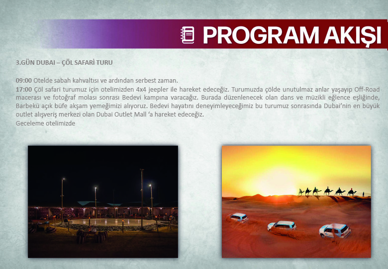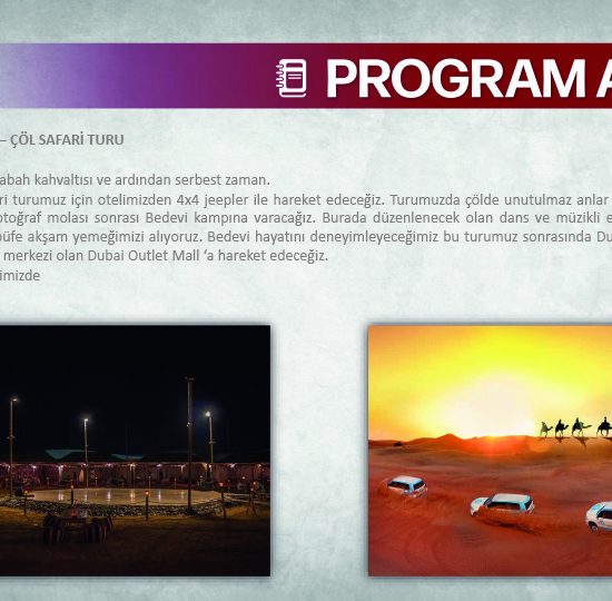 17:00 Çöl safari turumuz için otelimizden 4×4 jeepler ile hareket edeceğiz. Turumuzda çölde unutulmaz anlar yaşayıp Off-Road macerası ve fotoğraf molası sonrası Bedevi kampına varacağız. Burada düzenlenecek olan dans ve müzikli eğlence eşliğinde, Barbekü açık büfe akşam yemeğimizi alıyoruz. Bedevi hayatını deneyimleyeceğimiz bu turumuz sonrasında Dubai’nin en büyük outlet alışveriş merkezi olan Dubai Outlet Mall ‘a hareket edeceğiz.