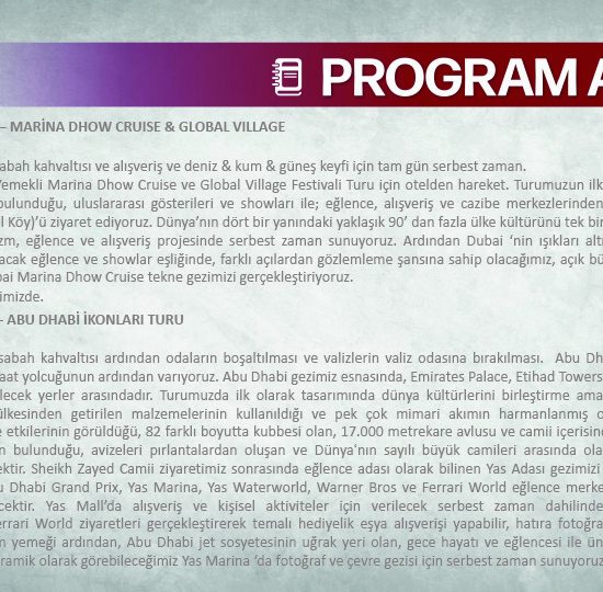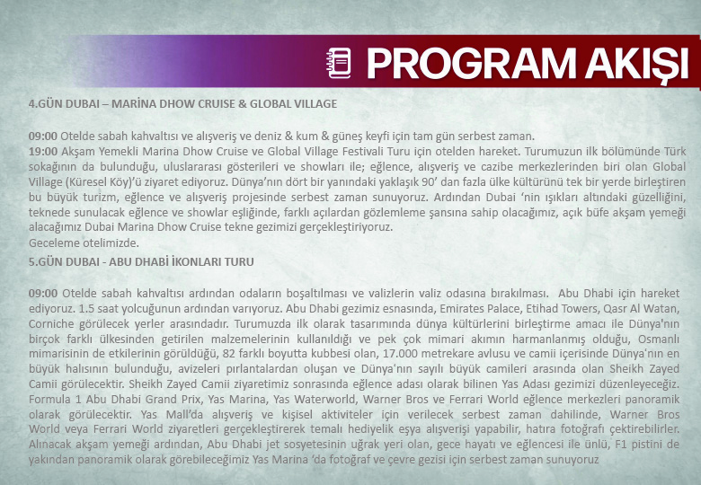 18:00 Akşam yemeği ve tur için otelden hareket ediyoruz. İlk olarak 828 metre yüksekliği ile Dünya ‘nın en yüksek yapısı olan Burj Khalifa’nın önünde bulunan ve Dünya’ nın sayılı yapay göllerinden biri olan Burj gölündeki renk oyunları, ışık ve ses gösterisi ile senkronize olan “The Dubai Fountain Show‘u izliyoruz. Alışveriş ve çevre gezisi için Souk Al Bahar – Dubai Mall‘da sunulacak serbest zaman Lokal restoranda alınacak akşam yemeği. Ardından petrol öncesi Dubai’nin lokal hayatını gözlemleyebileceğimiz, ilk yerleşim yeri olan Bastakiya Bölgesi’ni ve bu bölgede bulunan Bedevi mahallelerini, geleneksel dar sokakları, Meena Pazarını; lokal mimarisi ünlü Al Seef‘i ve pazarlarını gezeceğiz. Alışveriş ve kişisel aktiviteler için serbest zamanın sonrasında otele transfer.